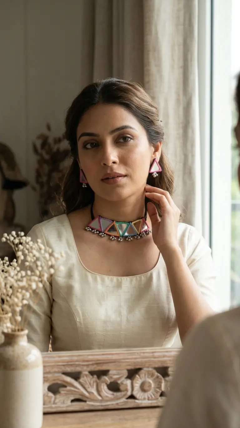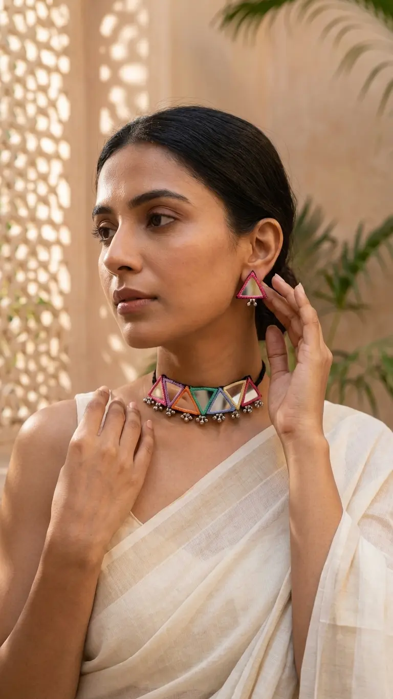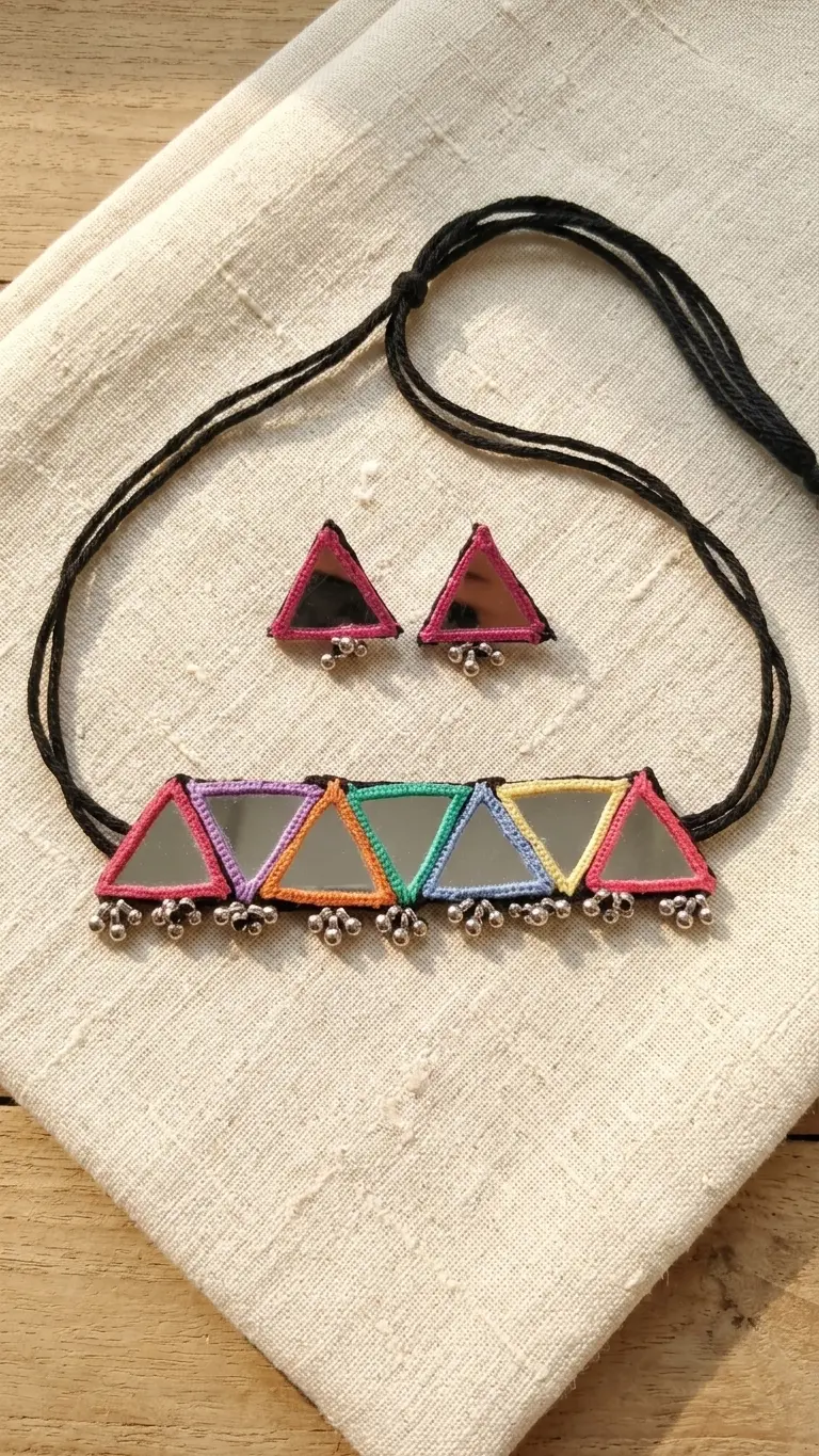 Add vibrant charm to your style with this handmade multicolor macrame mirror necklace set, beautifully crafted with colorful threads and geometric triangle mirror designs. This stunning jewelry piece reflects a perfect blend of traditional Indian craftsmanship and modern boho fashion.