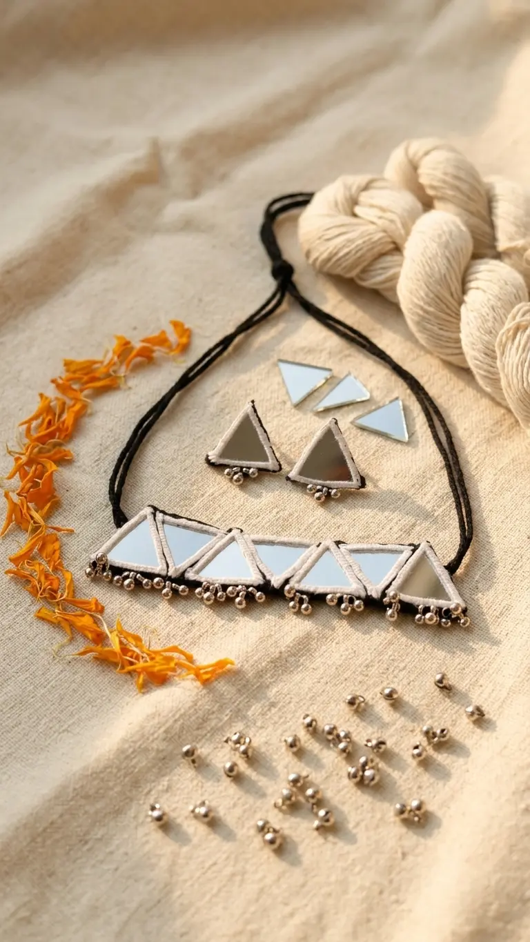 The lightweight design ensures all-day comfort while adding a bold and artistic touch to your outfit. Paired with matching earrings, this mirror work necklace set is a must-have for your jewelry collection or a thoughtful gift for your loved ones.