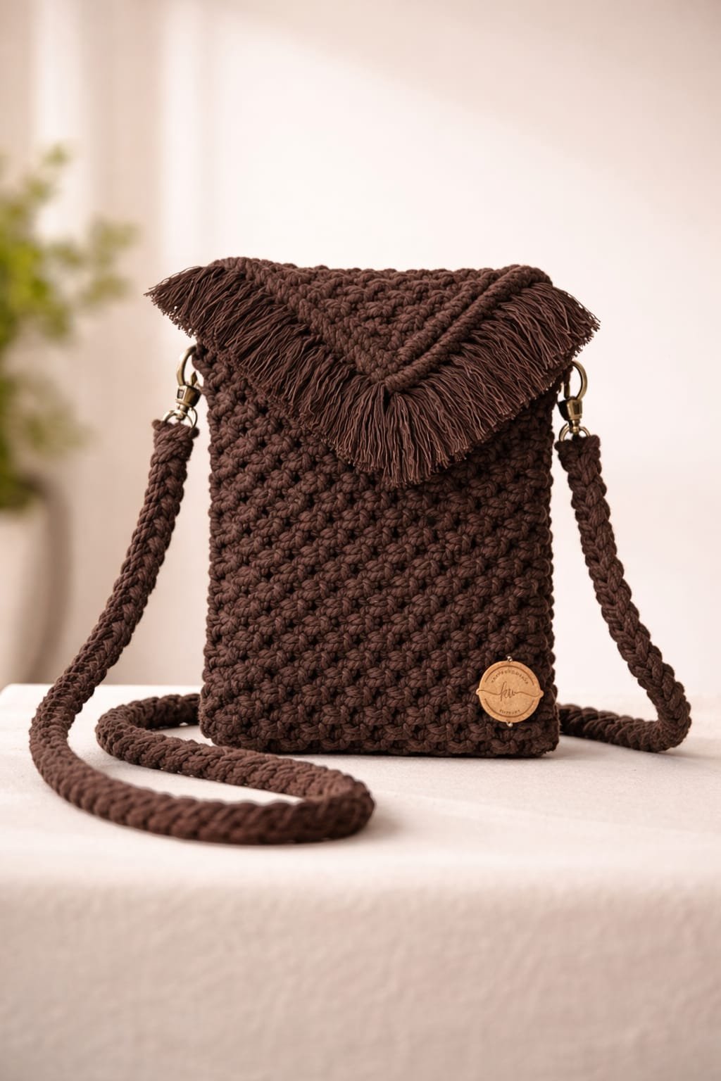 Keep your essentials stylishly organized with this handmade macramé mobile bag. Designed for convenience and elegance, this compact crossbody pouch securely holds your phone while adding a trendy boho touch to your outfit.