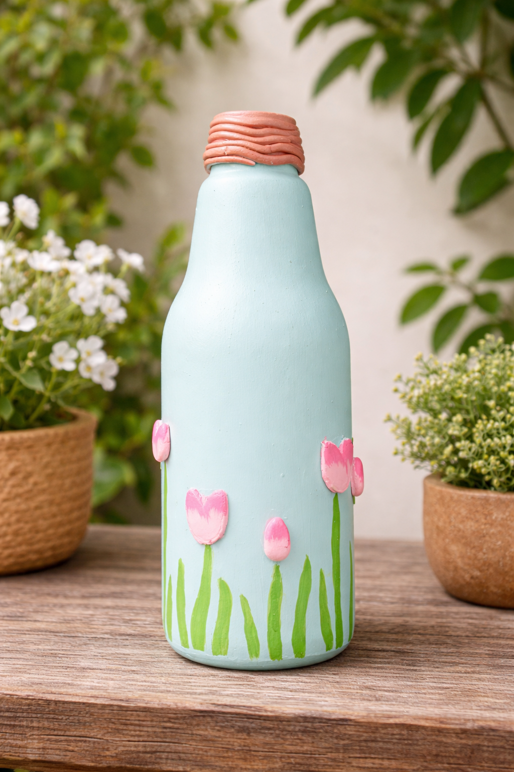 Add a soft, charming touch to your home with this hand-painted decorative glass bottle, beautifully finished in a pastel blue base with delicate pink floral artwork. Designed with a rustic painted neck and a smooth matte finish, this bottle brings a calm, garden-inspired vibe to any space.