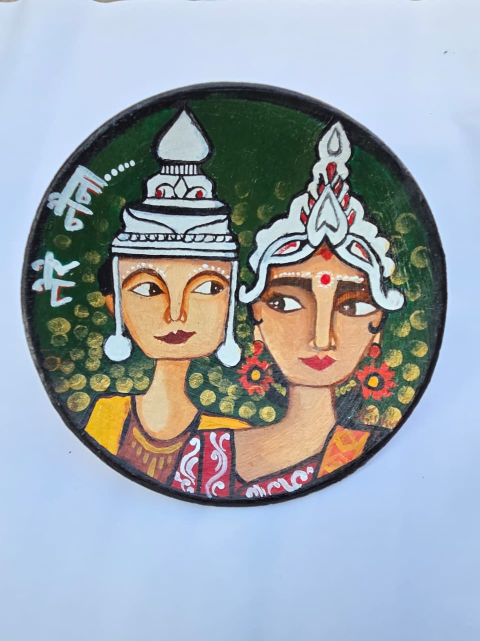 It features influences from Bengali/Odisha folk art and Pattachitra-style detailing using acrylic colours.