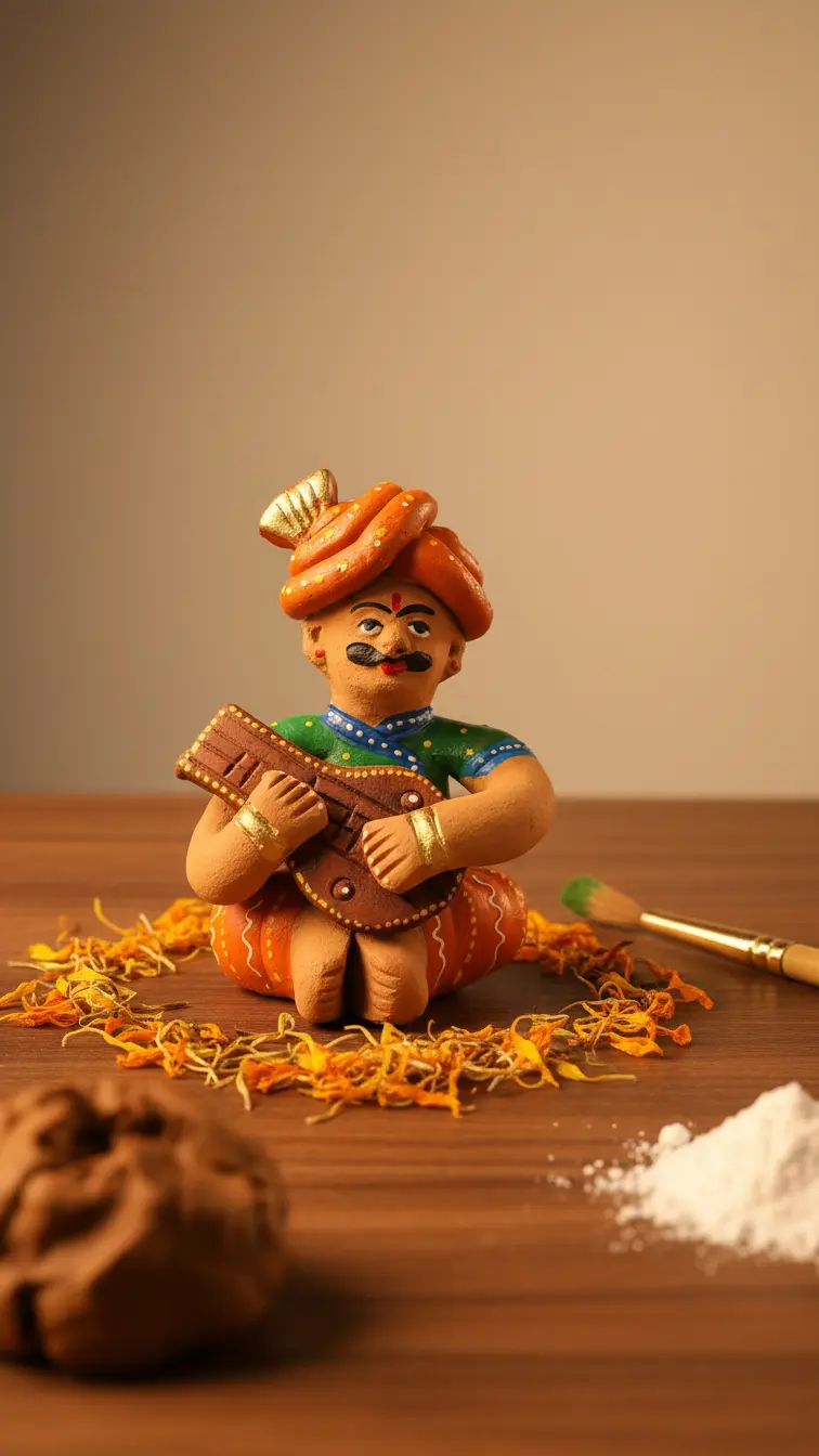 It depicts a traditional Rajasthani folk musician in vibrant attire playing a