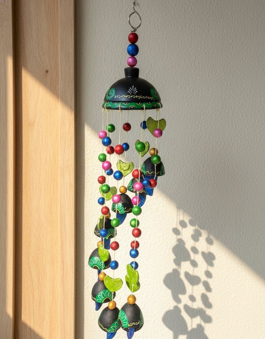 It is crafted from hand-molded terracotta bells, acrylic paint, colourful