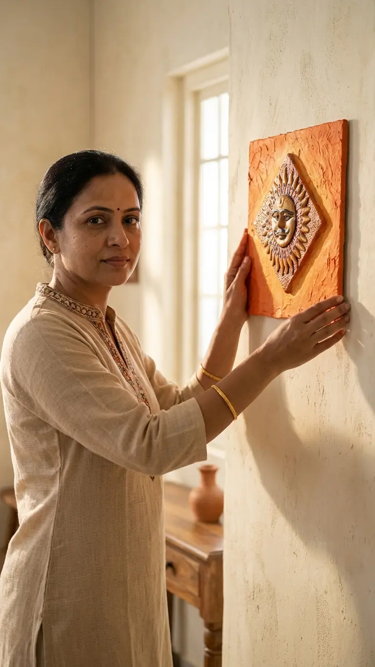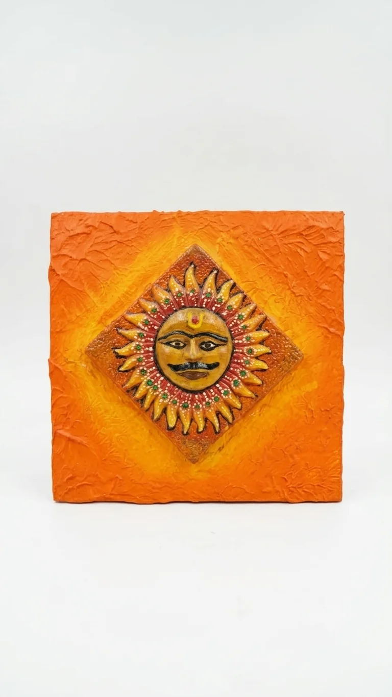 Illuminate your home with positive energy and artistic elegance through our Handmade Religious Terracotta Sun Frame. This stunning wall décor features a beautifully crafted Surya (Sun God) relief mural, made from terracotta and mounted on a textured wooden base with permanent vibrant paints.