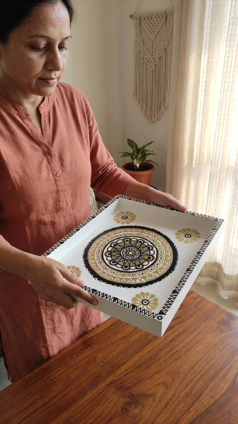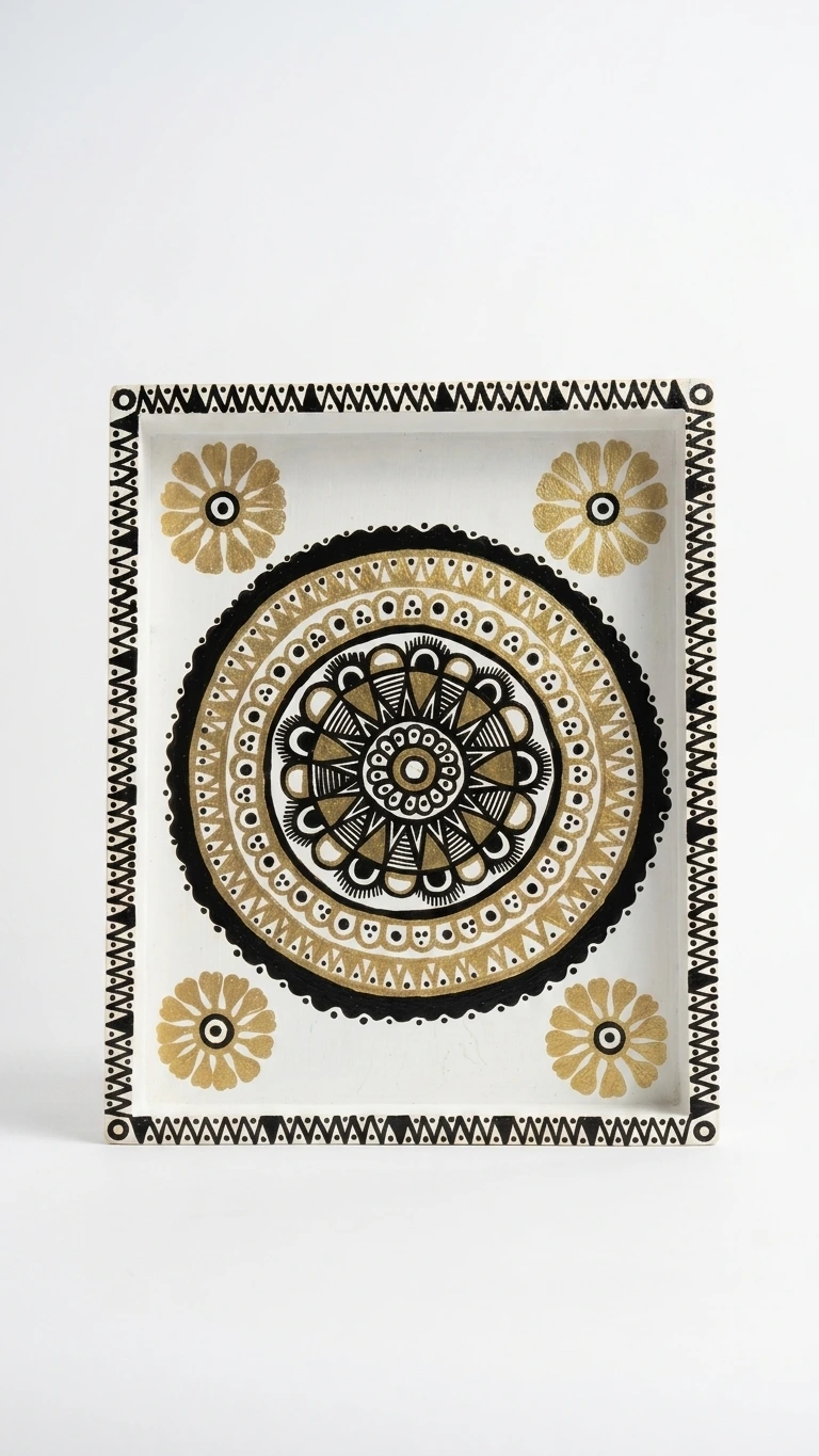 Handmade White Gold Mandala Wooden Serving Tray 8×10 Inch | Waterproof Washable Decorative Tray | Custom Indian Art Tray for Home Décor & Gifts