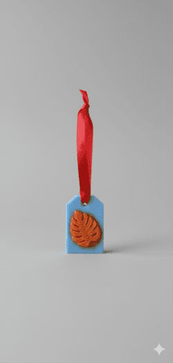 Hanging wax room freshener with blue base, orange leaf emboss and red ribbonHanging Handcrafted Wax Room Freshener – Blue Tag with Orange Leaf Design