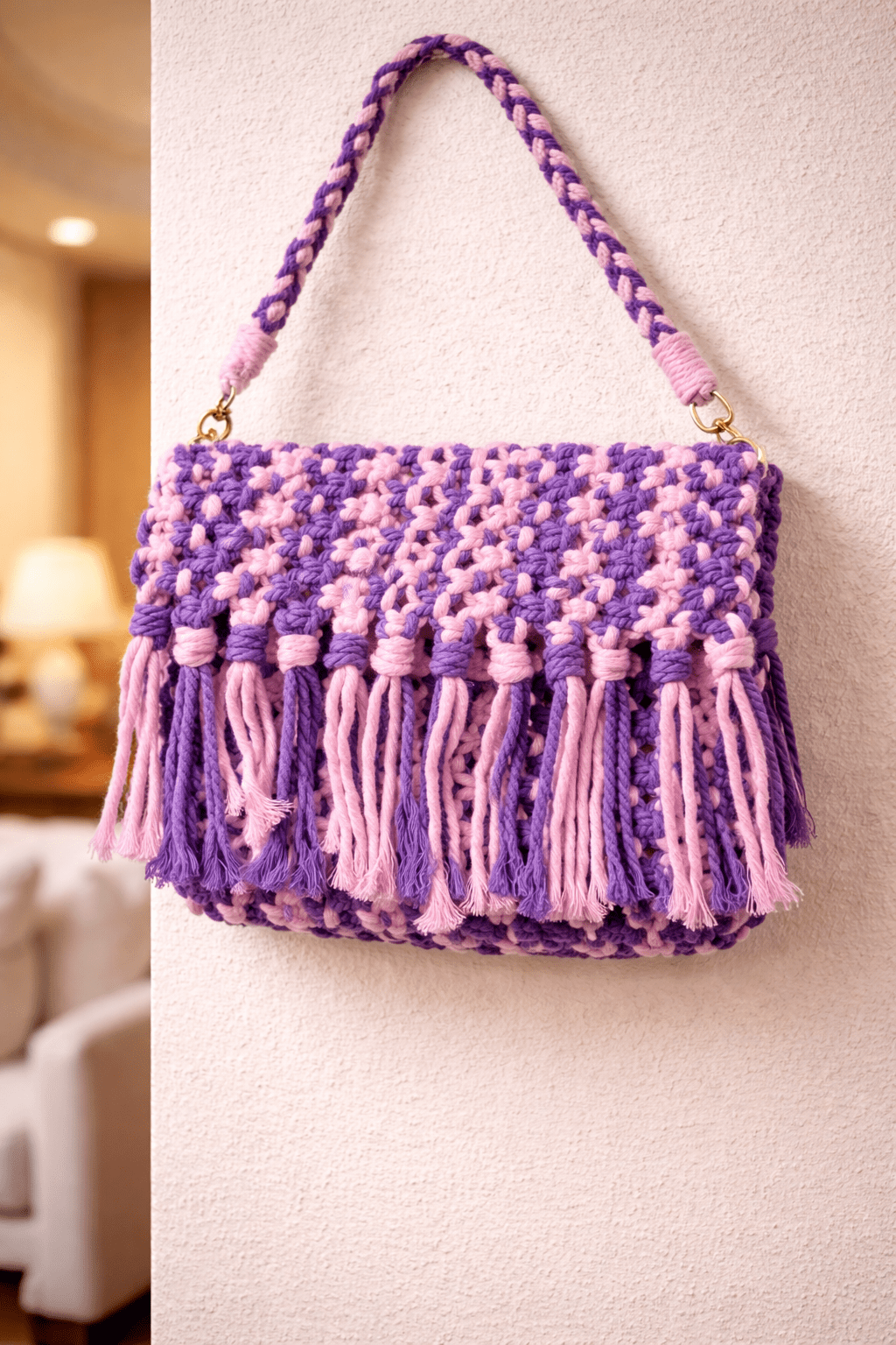 Add a touch of boho elegance to your wardrobe with this handmade macramé purse, carefully crafted by skilled artisans using high-quality cotton cord. The intricate knotting, soft pastel colors, and flowing fringe details make this bag a true statement piece.