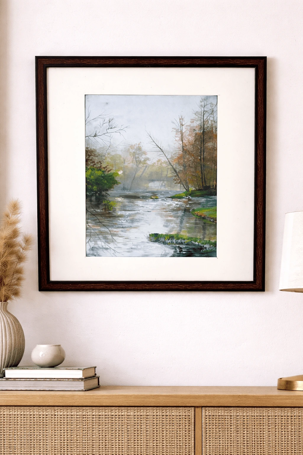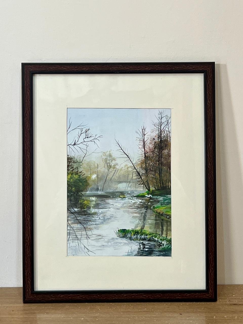 “Handmade watercolor and acrylic river landscape painting with forest and water reflections, framed wall art by Jeel”“Still Waters” – Original River Landscape Painting by Jeel | Handmade Nature Wall Art