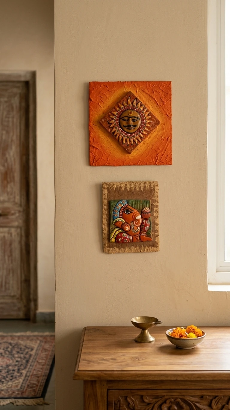 Enhance your space with divine energy and artistic elegance through our Terracotta Relief Religious Frames featuring Ganesha and Sun motifs. These handcrafted pieces are created using terracotta relief work, mounted on a sturdy wooden base, and finished with rich textures and permanent colors.