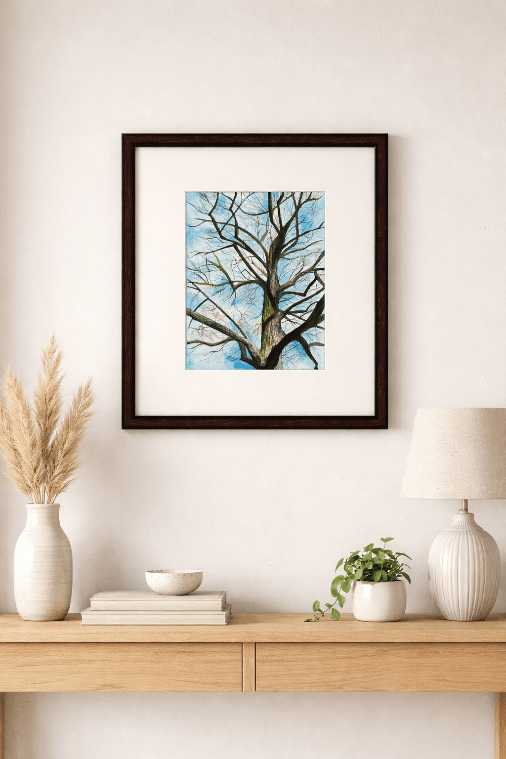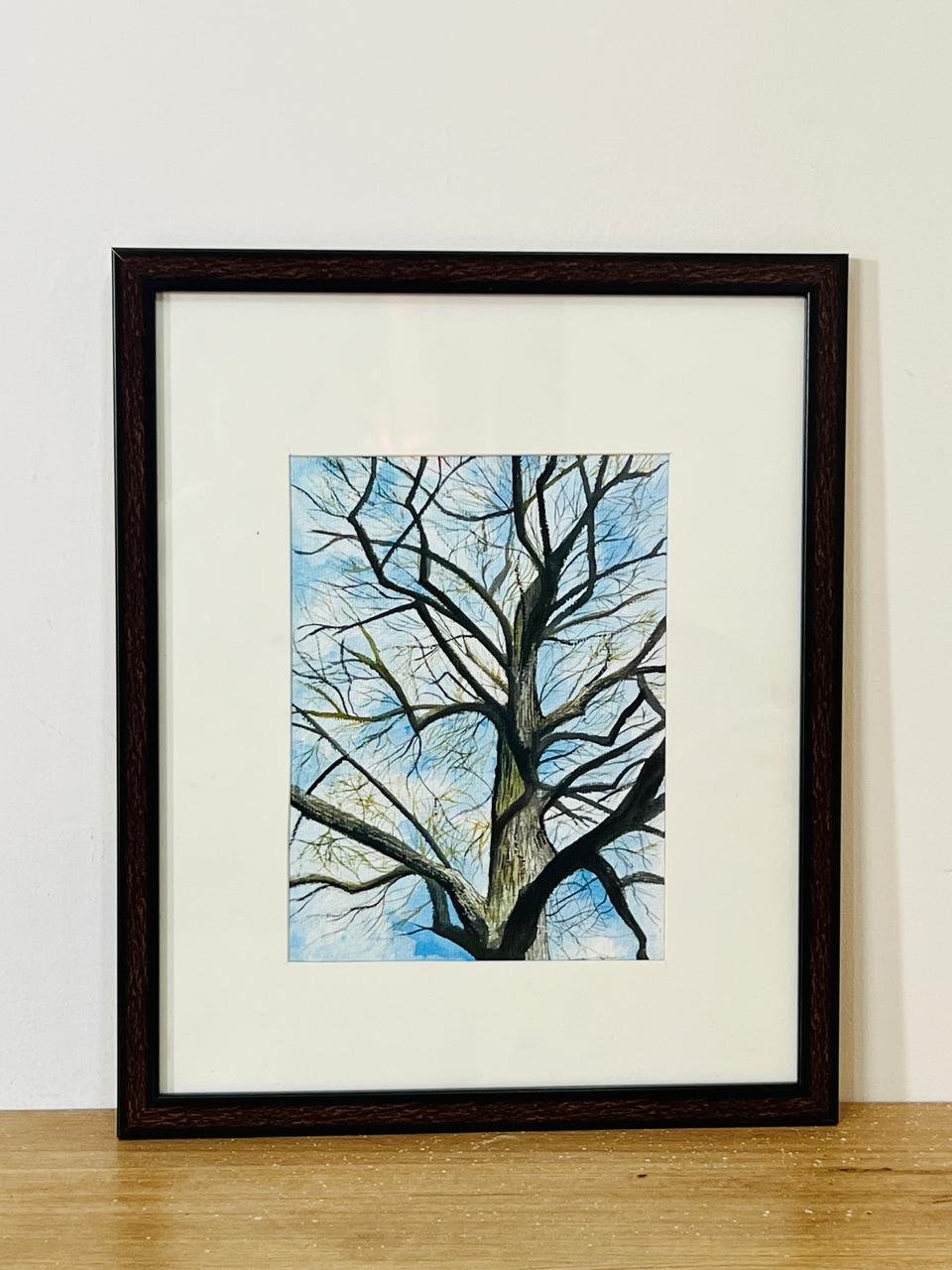 “Original handmade tree painting by artist Jeel, watercolor and acrylic on cold press paper, framed nature wall art”“Whispers of Winter” – Original Tree Painting by Jeel | Handmade Nature Wall Art